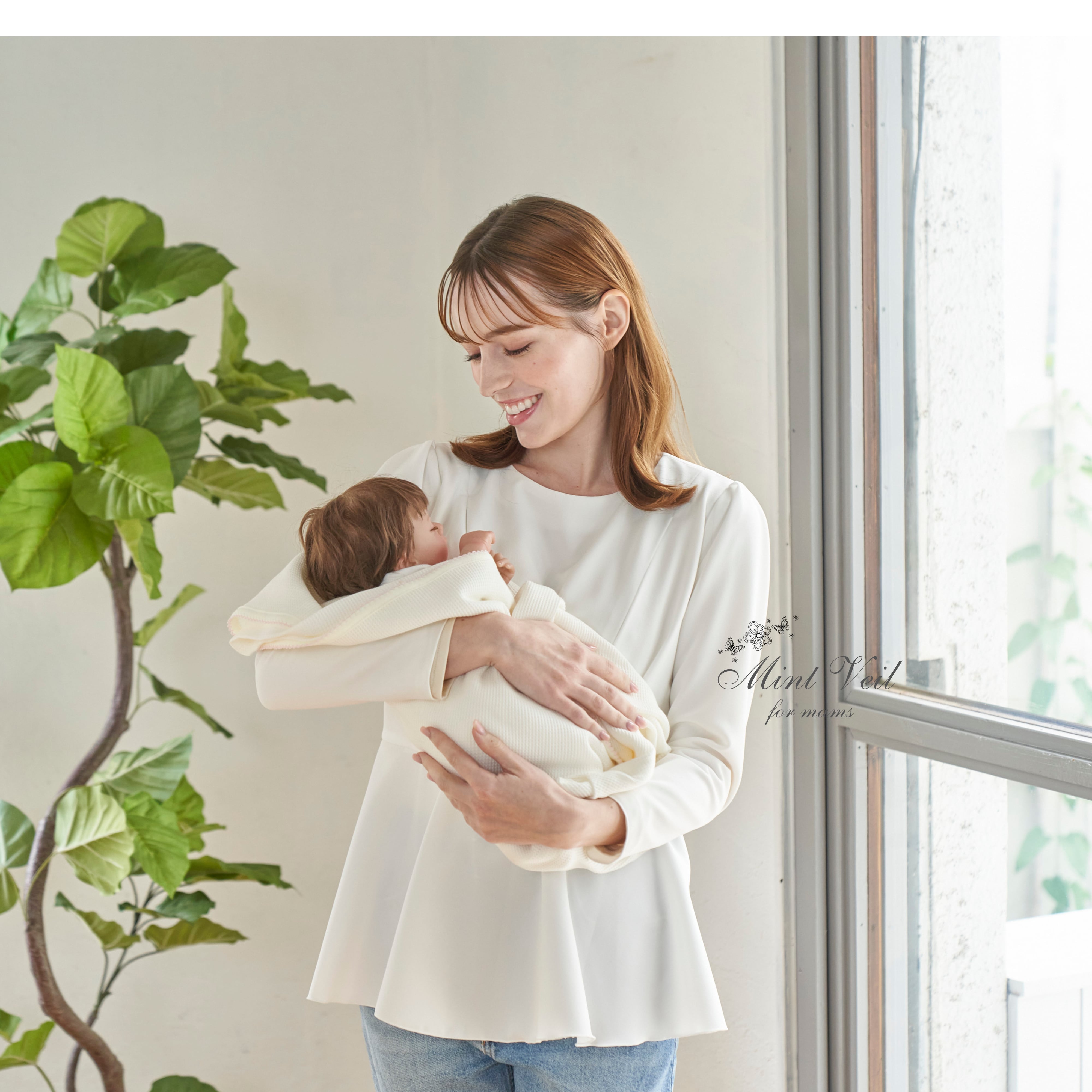 【3月初旬 発送予定】 ただ可愛いだけじゃない。 今の毎日に、ちゃんと寄り添う一枚。 やわらかなホワイトに、さりげない刺繍。 顔まわりを明るく見せながら、ふんわりと広がるシルエットで動くたびにやさしい印象をつくります。 そして、さりげない授乳スリットがあることで、背中のファスナーを無くしました。 外からは分からない設計で、日常でもお出かけでも自然に着ていただけます。 胸元はコットン素材で、抱っこ紐派のママにも安心感を。 (モデル身長158㎝) 【サイズ】 Free 【素材】 表地 ・基本ホワイト生地:ポリエステル92%、ポリウレタン8% (防シワ・紫外線防止・リサイクル素材) ・胸元ホワイト生地:コットン100% お洗濯の際には手洗いを推奨いたします。 濡れた状態で干していただくとよりシワになりづらいです。 ------------------------------------------- 透け感:なし 裏地:なし 伸縮性:なし 生地の厚さ:普通(胸元 薄め) お手入れ:ホームクリーニング(手洗い)可能 仕様:授乳対応 【サイズ】 設定着丈:75㎝ バスト:110㎝(内側) ウエスト:100㎝(内側) 裾幅:120㎝ えり横幅:20.6㎝ 袖丈:54.5㎝ 袖幅:20.9㎝ 袖ゴム:26㎝(最大) ※平置きにて測定 ※若干の個体差が生じる場合がございます。ご了承ください。 【ポイント】 ・胸元に繊細な刺繍入り ・ふんわり広がるチュニック ・ヒップラインを自然にカバーする丈感 ・抱っこ紐でも安心の柔らか素材 ・外主先での授乳の安心 ・背中のファスナーなし 【生産国】 日本